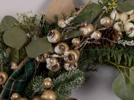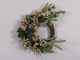 27" grapevine wreath with green picks, golden berries, and muti-ribbon bow