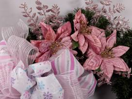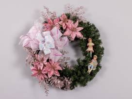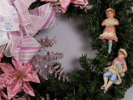 21" green wreath with pink poinsettias, leaf picks, multi-pink bow, and skating ornaments