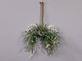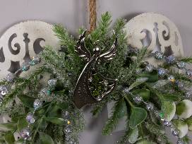 10" by 10" metal angel wings with frosted greens, silver picks, and angel ornaments