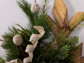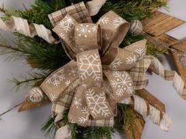 22" wooden snowflake with greens, beige picks, and burlap bow