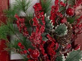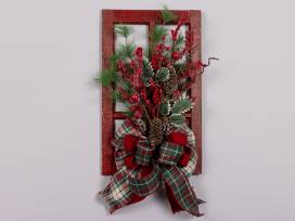 26" by 12" wooden window pane with greens, berries, pinecones, and tri-color bow