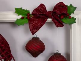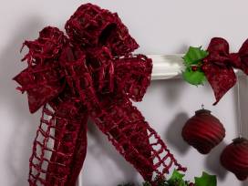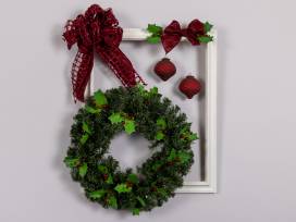 28" by 21" white frame with green wreath, holly berries, glass ornaments, and multi-ribbon bows