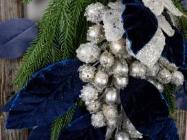 26" by 14" wooden window frame with greens, blue and silver leaves, and silver berries