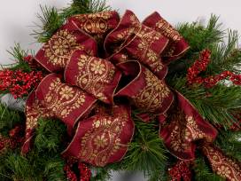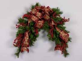 28" green swag with large burgundy and gold bow and ribbon and red and gold berries