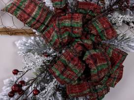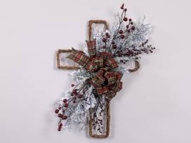 22" grapevine cross with snowy picks, berries and ice picks, and a burgundy and green bow