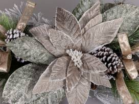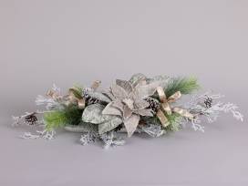 40" by 17" wooden bread bowl with snowy picks, branches, pinecones, large snowy poinsettia, and gold ribbon