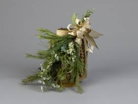15" by 16" wooden lantern with rope handle, adorned with frosty greens and berries and a gold bow