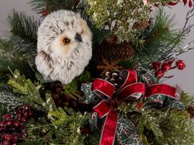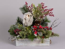 Wooden box with assorted snowy greens, berries, red leaves, pinecones, small owl, and multi-ribbon bow
