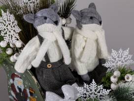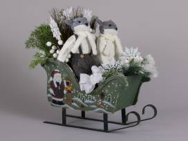19" by 22" painted wood sleigh with fox couple, greens, berries, snowflakes, and white bows