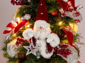 32" tree with red leaves, berries, and balls, and silver leaves, balls, and berries in a red glass vase