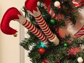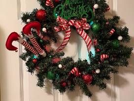 This wreath looks like an elf had a sugar rush and decorated it himself! With glittery green, red, and white balls , twinkling lights, candy canes galore, and even a pair of elf feet sticking out, it's basically Christmas cheer doing a joyful cartwheel on your door. (20'' wreath)