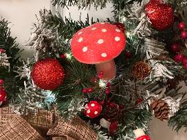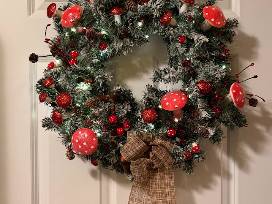 Bring the outdoors in with this unique and "down to earth" wreath adorned with loads of mushrooms, acorns and pinecones! This wreath is perfect for the nature-lover or to decorate your cottagecore space during the holiday season. (20" wreath)