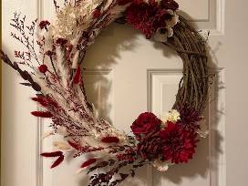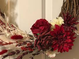 A harmony of soft feathers, deep red florals, and natural textures, this wreath captures the spirit of transformation - where passion meets peace. Each detail tells a story of warmth, elegance, and timeless charm. 18" wreath.