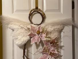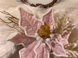 This elegant angel wreath combines soft faux feathers and blush colored velvet poinsettias to create a gentle symbol of peace and hope. Delicate gold accents and a gold halo bring a touch of heavenly sparkle to the angel. 26" tall 32" wide