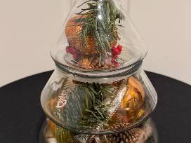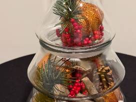 Celebrate the season with this glass Christmas tree filled with orange ornaments, ribbon, pinecones, berries, logs, and greenery. 5 1/2 " wide x 10" tall.