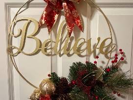 (16" wreath) Add a touch of festive magic to your home with this beautifully handcrafted holiday hoop wreath. Featuring the word "Believe" in elegant gold script, this unique piece combines traditional holiday charm with a modern minimalist design.