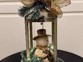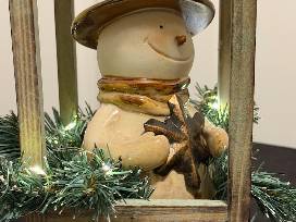 Capture the magic of the season with The Frosty Glow, a rustic holiday lantern glowing with warmth and charm. Inside, a gold-and-white porcelain snowman stands amidst frosted greenery, surrounded by the soft twinkle of warm white fairy lights that bring a cozy, wintry glow to any space. A golden bow crowns the top, adding an elegant touch of holiday sparkle, while the battery pack is discreetly placed inside near the snowman for a seamless look. Measuring 4½ inches across the square base and 14" tall, this piece is perfectly sized for mantels, shelves, or tabletops. Lit with warm white fairy lights.