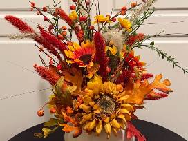 Bring autumn's radiance into your home with this Harvest Elegance Floral arrangement! Embrace the beauty of the season with this stunning handcrafted floral centerpiece. Our Harvest Elegance arrangement features a vibrant mix of sunflowers, berries, and grasses in warm autumn hues, all beautifully presented in a sophisticated white pumpkin vase. Perfect for your Thanksgiving table, mantel, or as a welcoming gift. (12" round base, 18" high)