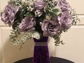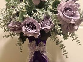 Elevate your space with this stunning and sophisticated handcrafted floral arrangement. Our Regal Rose Arrangement features delicate lavender roses and lush frosted green eucalyptus, arranged in a beautiful amethyst-toned glass vase. The soft colors and elegant design create a serene and luxurious atmosphere, perfect for a living room, bedroom, or entryway table. (18" w X 20" h)