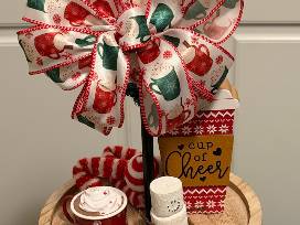 A two-tiered tray that celebrates all things cozy and sweet - from cocoa mugs, to cups full of candies and chocolate stirring spoons, to signs that say 'smore please' and 'cup of cheer.' A festive bow of red and green mugs ties it all together at the top of the tray, making this the perfect display for a coffee bar, kitchen, or gathering place. 10" wide by 20" high