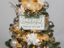 4-foot tree with white lights, gold and silver deco mesh, berry picks, and a sign reminding us it's the most wonderful season of all!