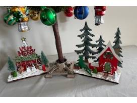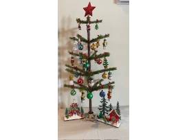 Vintage Hallmark feather tree with glass Nutcracker and ball ornaments. It has two small holiday scenes under the tree (24" x 10")