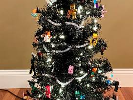 Bring the world of Minecraft to your holiday decor! This one-of-a-kind 3-foot black mini Christmas tree is decked out in full Minecraft style - topped with a playful Zombie Chicken Jockey figure. The tree glows with opaque green lights and features a variety of Minecraft action figure ornaments, purple glass "block" garland, and a Minecraft-themed tree skirt to complete the look. Perfect for any Minecraft fan, this festive mini tree will add pixel-perfect fun to your home or office this holiday season!