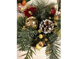 Vintage inspired, antique-gold glass footed bowl overflowing with an arrangement of faux evergreens and Christmas decor in the traditional Christmas tones of deep reds, green, and gold.