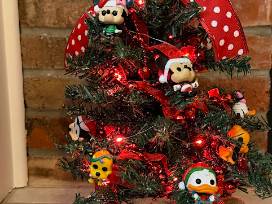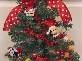 18" tabletop tree decorated with 12 different Disney Bitty Pops, red with white polka dots bow on top, lit with red fairy lights, and red beaded and lace garland.