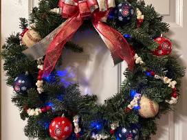 Calling all Cubs Fans!! 22" Cubs Wreath lit with red fairy lights, red and blue Cubs ornaments, 2 real baseballs, popcorn and cranberry garland. A sheer red and silver bow is on the top.