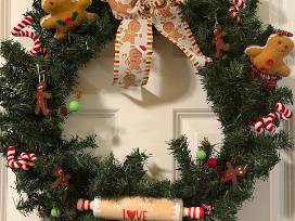 This "Baked with Love" Gingerbread Wreath is a festive blend of cozy nostalgia and charm. Adorned with smiling gingerbread figures, candy cane twists and a whimsical rolling pin that reminds everyone your home is "Baked with Love." This 24 inch wreath captures the sweetness of the season.