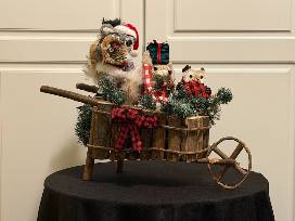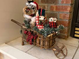 Bring a touch of holiday woodland charm to your home with this rustic woodland handcrafted wheelbarrow filled with three woodland friends. Greenery, pine accents, wood textures, Christmas gifts join the raccoon, squirrel and owl in this festive display. A matching wreath on the back of the wheelbarrow completes this piece. (18" (l) x 8" (w) x 14" (h))