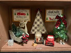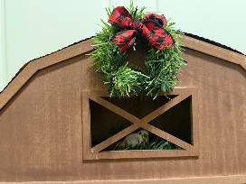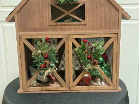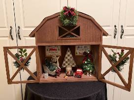 Bring the warmth of the countryside to your holiday décor with this handcrafted Rustic Christmas Barn Display. This delightful barn scene opens its doors to reveal a cozy farmhouse Christmas - complete with festive greenery, a red vintage truck, snow-dusted trees, farm dogs, and a cheerful reindeer. Every detail, from the buffalo plaid bows, small lit Christmas Tree, to the miniature signs, captures the nostalgic charm of a simpler holiday season. Perfect for a mantel, entryway, or tabletop centerpiece, this one-of-a-kind display adds a welcoming farmhouse touch to your Christmas home. A wonderful gift for anyone who loves rustic or vintage holiday décor! (17" (L) x 16" (H) x 6" (W))