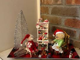1Miniature holiday bear scene to bring warmth and charm to your holiday décor. Featuring 2 handcrafted Shaz Bears seated in miniature chairs. The charming Christmas hutch is filled with tiny gifts, cookies, a wreath, and other holiday décor. Set on a buffalo plaid tray with a shimmering silver tree and happy holidays banner. Look close to find all the tiny details is this delightful Christmas scene! (Check out handmade Shaz Bears online at https://www.bearpile.com/...many selling for between $120-$220 EACH. Original adoption tags are included with the project. (14"(L) X 6.5" (W))