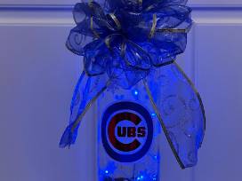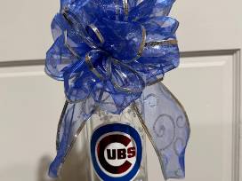 14" x 3" tall wine bottle with fairy lights and decorated with the Cubs' logo and snowflakes. A blue and silver bow complete this piece.