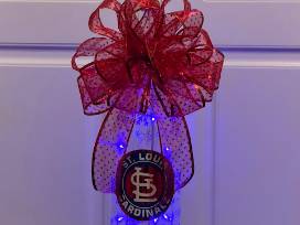 14" x 3" tall wine bottle with fairy lights and Cardinals' logo and snowflakes. A red sheer bow completes this piece.