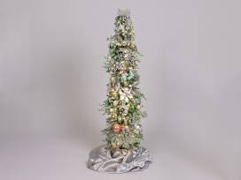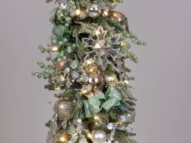 5-foot slim flocked alpine tree with green, pink, and cream decor, berries, leaves, and sprays in shades of green, pink, silver, aged mirror snowflakes, silver tree skirt, with green and silver ribbon.