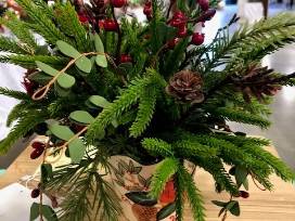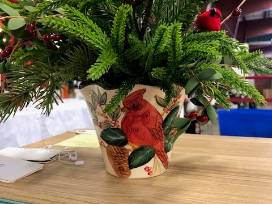 Ceramic vase with painted cardinal, assorted greens and picks, with tiny cardinals. 12" H X 13" W