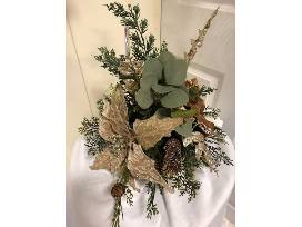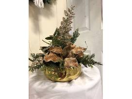14" by 15" metal bowl with greenery, pinecones, gold leaves, and brown poinsettias