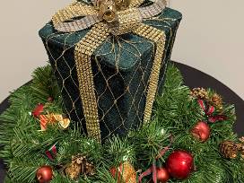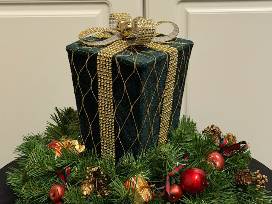 A wooden charger plate holds a pine wreath decorated with festive holiday accents and small green gift with gold trim attached. (16" diameter; 11" high)