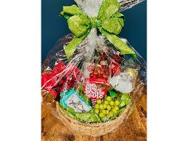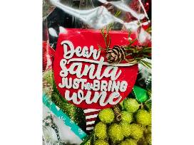 Complete with two wine glasses, a "Dear Santa Just Bring Wine" table decoration, a poinsettia plate, holiday napkins, and a reindeer wine stopper, this basket is ready to pour on the holiday cheer. A toast-worthy trio that's sure to make spirits bright!