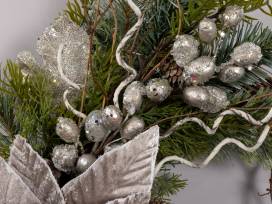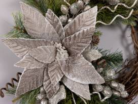 23" grapevine wreath with greens, frosty berries, and a silver poinsettia