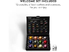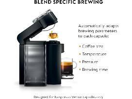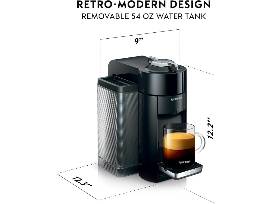 Choose from four cup sizes-1.35 oz Espresso, 2.7 oz Double Espresso, 5 oz Gran Lungo, or 7.7 oz Coffee-and enjoy a fast 15-20 second heat-up for quick mornings. Features include a 54 oz water reservoir, adjustable drip tray, and automatic capsule ejection with a used-capsule container that holds up to 17. Includes a complimentary welcome set of assorted Vertuo capsules.