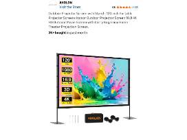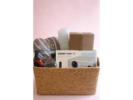 Basket includes a barefoot dreams blanket, wine glasses, bottle of red wine, gourmet popcorn, popcorn containers, Roku TV smart projector, and 120" indoor/outdoor portable projection screen