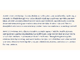1During this consultation we will explore your social media, marketing or PR goals. We'll talk through your vision, identify challenges, and come up with some new ideas, all while creating action items for you to move forward. You will receive a custom document summarizing our session with a clear checklist of what to do next. This is a thoughtful, collaborative session to help you feel more confident about promoting yourself!