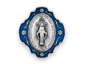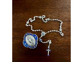 A finely detailed silver rosary, accented with striking blue enamel, resting in a silver case depicting the Miraculous Medal. This portable design ensure you can carry it easily and pray at any moment.