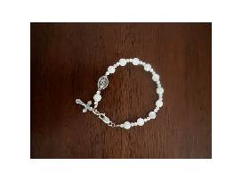 Luminous one-decade, rosary bracelet crafted from Mother of Pearl beads. This bracelet includes one Our Father bead, along with Crucifix and a Miraculous Medal, offering both elegance and a way to pray throughout the day.