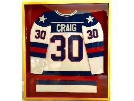Miracle on Ice: Autographed Jim Craig Team USA Jersey As the world turns its eyes to Italy for the 2026 Winter Olympics in Milano-Cortina, there is no better time to celebrate the underdog spirit that defined one of the greatest moments in Olympic history. Jim Craig is the goaltender who famously stopped 36 of 39 shots against the "invincible" Soviet Union, leading a ragtag group of college kids to the greatest upset in sports history. Jim Craig didn't just win a gold medal; he captured the heart of a nation during the legendary 1980 "Miracle on Ice" in the ultimate symbol of American sports triumph. The Jim Craig Team USA Jersey from the iconic Team USA features Craig's signature across the classic 1980 design, serving as a powerful reminder of the grit and determination it takes to reach the top of the podium. The jersey was hand-signed in Fiddlesticks GM Al Antonez presence. This pristine collector's piece is ready to be the centerpiece of any collection as we cheer on the next generation of Team USA stars this year.The jersey is beautifully framed in a "gold medal" gold frame measuring 36"w x 40 1/2" h.