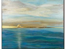 Layers of blue and turquoise form a steady visual field, offering a sense of depth and openness. These tones are balanced with soft greens that reference water and land, while gold introduces warmth along the horizon-subtle, stabilizing, and grounding rather than decorative. Pale, cloud-like forms emerge naturally as the inks separate and rest.
