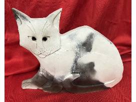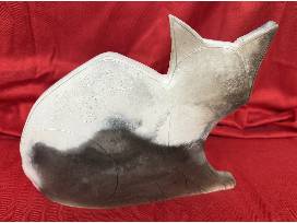 Mary Gates Dewey, sometimes referred to as "the cat lady" by neighbors, began making these sculptures in 1982 in her studio located in Athens, Ohio. Each piece is unique and created using a process called sawdust or "pit firing," where the exact coloring (a spectrum of white, gray, and black) is an accidental result of the firing process. Her work is highly sought after and can be found on online marketplaces and at auctions.
